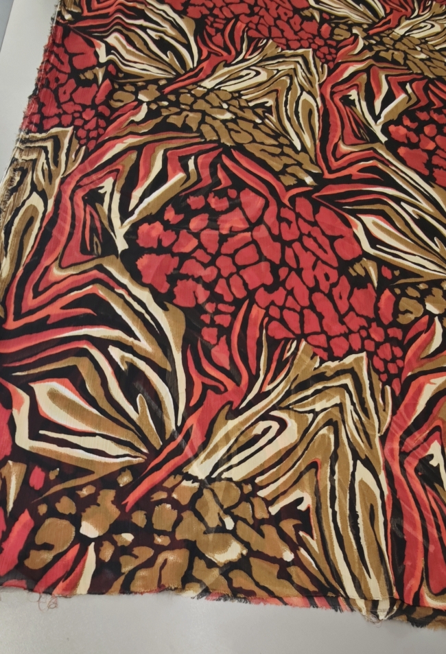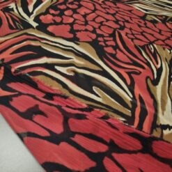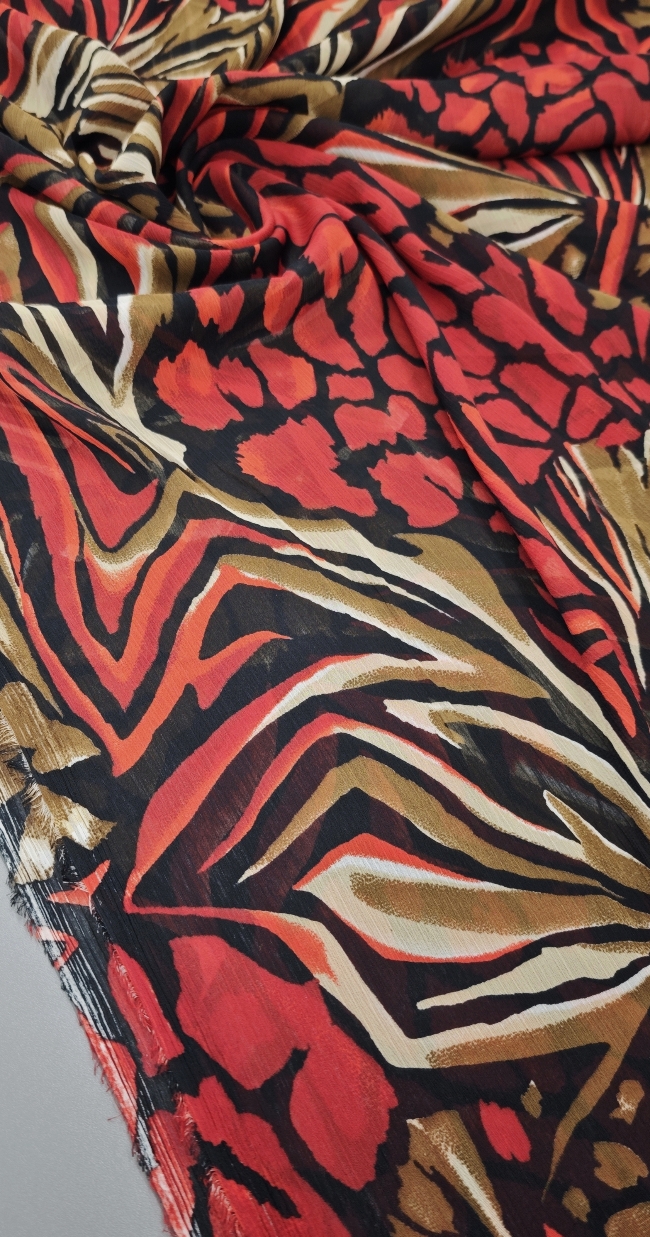 Žoržet z rdeče-črno-rjavim animal vzorcem prinaša eksotičen in moderen pridih v vsako kreacijo. Izjemno lahek in zračen material s težo le 77 g/m² je popolna izbira za bluze, obleke, tunike ali modne šale. Prosojna struktura daje tkanini nežno fluidnost, ki se čudovito prilega telesu in poskrbi za eleganten, a hkrati drzen videz. Naj bo vaša nova poletna kreacija edinstvena z žoržetom, ki navdihuje s svojo lahkotnostjo in divjim vzorcem.